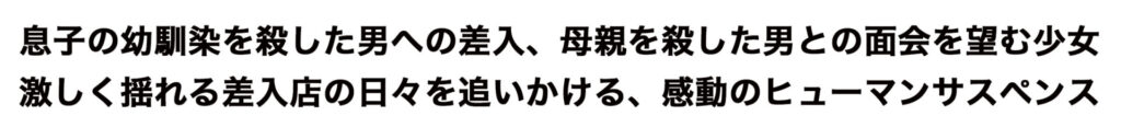 刑務所や拘置所に収容された人への差入を代行する「差入屋」。様々な事情から面会に行くことが出来ない人たちに代わって面会室へ出向くこともある仕事。そんな差入店を営む家族の絆と、彼らが巻き込まれる不可解な事件を描き、人間の可笑しさと切なさ、ダークサイドから希望に満ちた光まで追いかける感動のヒューマンサスペンス。